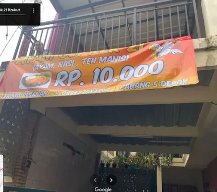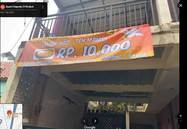 Ayam geprek dan minum.Ayam geprek adalah hidangan ayam goreng tepung khas Indonesia yang diulek atau dilumatkan bersama sambal pedas. Ayam geprek biasanya disajikan dengan nasi putih, lalapan, dan berbagai macam sambal. Kata “geprek” dalam bahasa Jawa berarti “dipukul”, “ditekan”, atau “dilumatkan”, yang merujuk pada proses menghancurkan ayam goreng tepung agar lebih mudah disantap