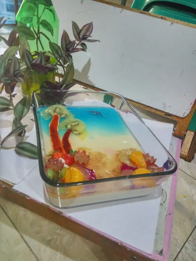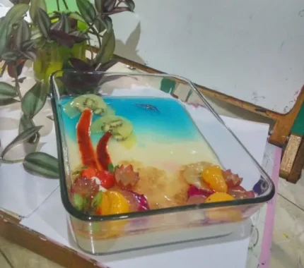 puding susu dengan topping buah segar.Puding adalah hidangan penutup (dessert) yang memiliki tekstur lembut dan kenyal, serta rasa manis. Puding biasanya dibuat dari campuran bahan-bahan seperti susu, gula, dan bahan pengental seperti agar-agar, gelatin, tepung maizena, atau telur. Puding bisa disajikan dingin maupun hangat, dan seringkali diberi tambahan rasa seperti cokelat, vanila, atau buah-buahan