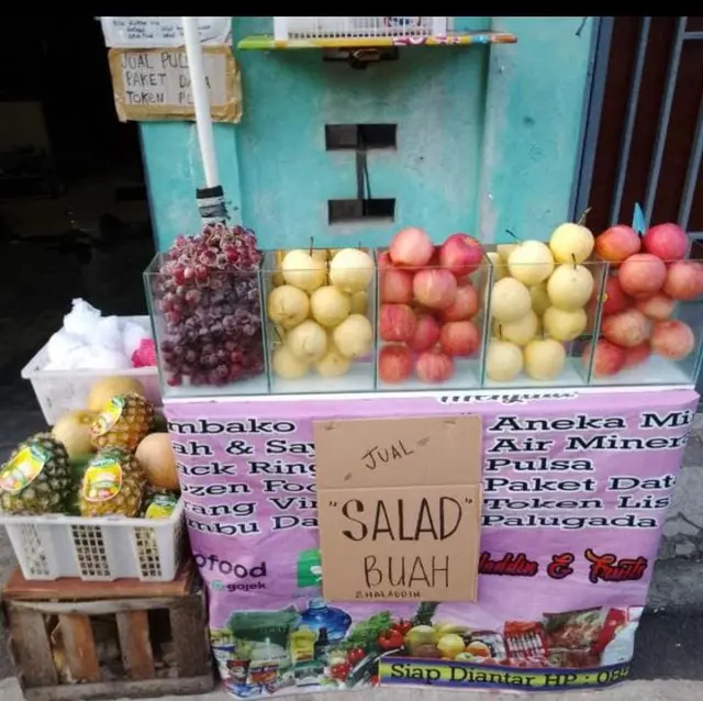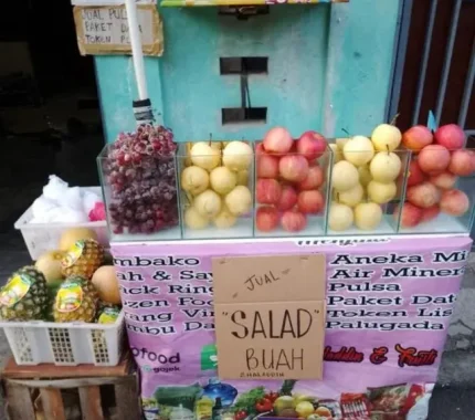 Menjual salad buah,dan makanan lainnya.Salad buah adalah hidangan yang terbuat dari berbagai macam buah-buahan segar yang dipotong-potong dan dicampur menjadi satu. Biasanya disajikan dengan saus atau dressing yang terbuat dari mayones, susu kental manis, atau yogurt. Salad buah seringkali disajikan sebagai hidangan penutup atau camilan sehat karena kandungan vitamin dan seratnya yang tinggi.